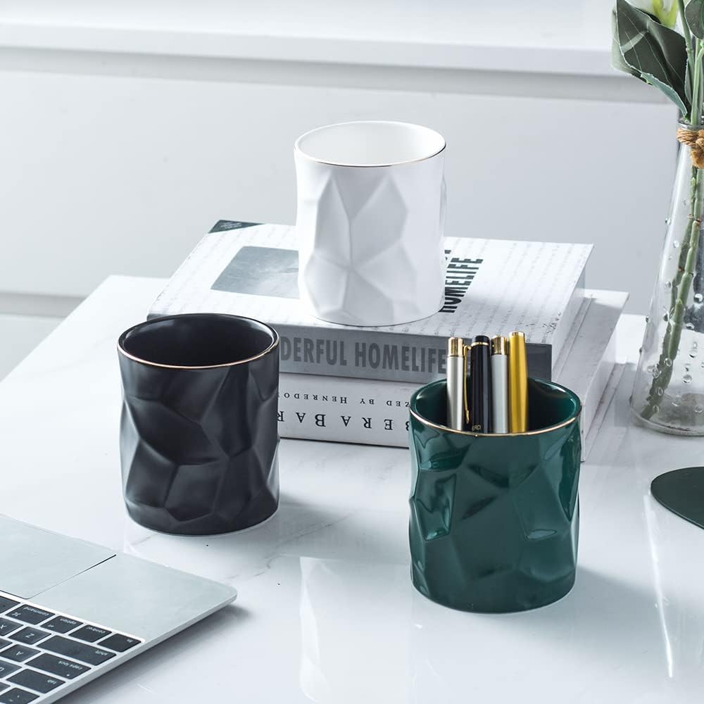 Ceramic Irregular Round Pen Holder For Desk Cute Stand Gold Line Aesthetic Pencil Cup Pot Desk Organizer for Men Women Makeup Brush Holder (Black)